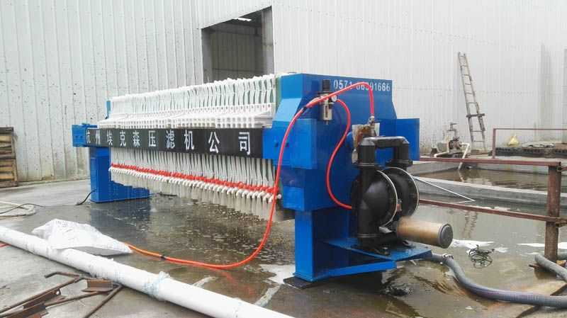 隔膜壓榨壓濾機是由隔膜板和廂式濾板排列組成濾室,在輸料泵的壓力作用下將料漿輸入濾室,通過過濾介質(zhì)(濾布)將料漿中的固體和液體分離,當(dāng)料漿中的固體形成餅后,再向隔膜通入空氣,對濾室內(nèi)的固體充分壓榨。