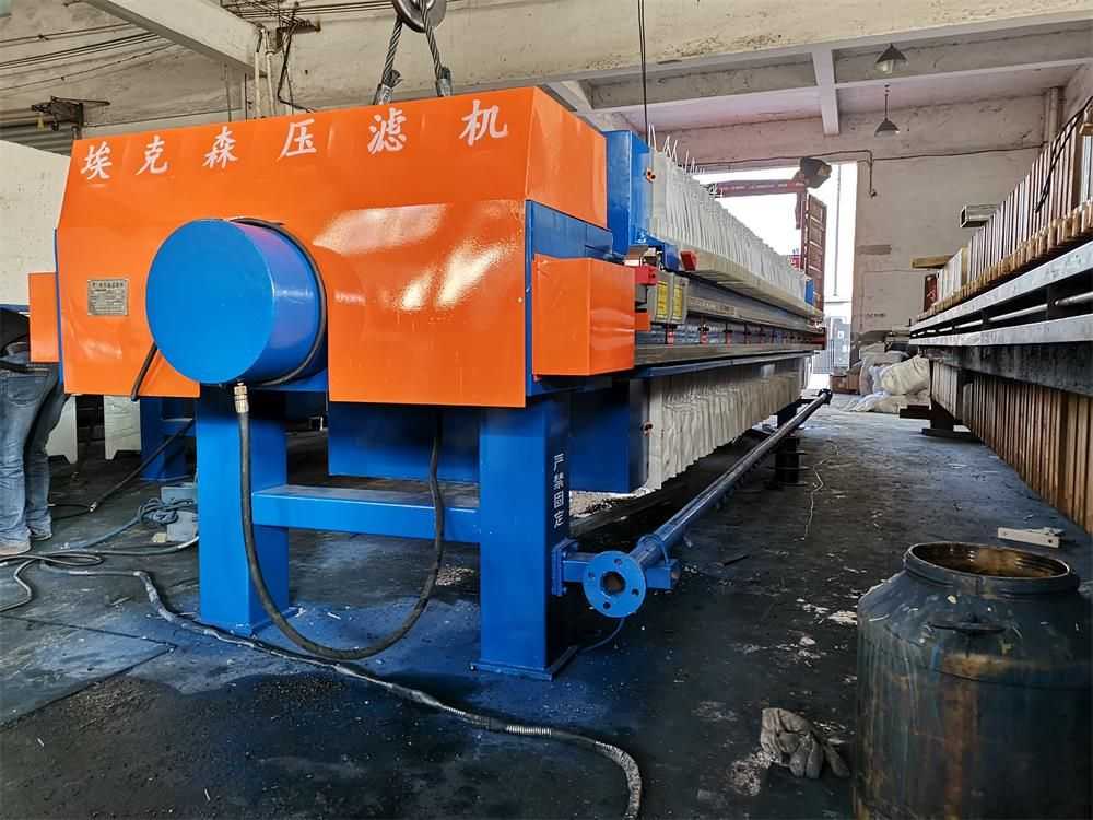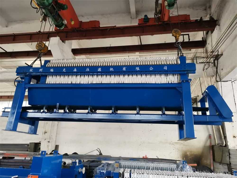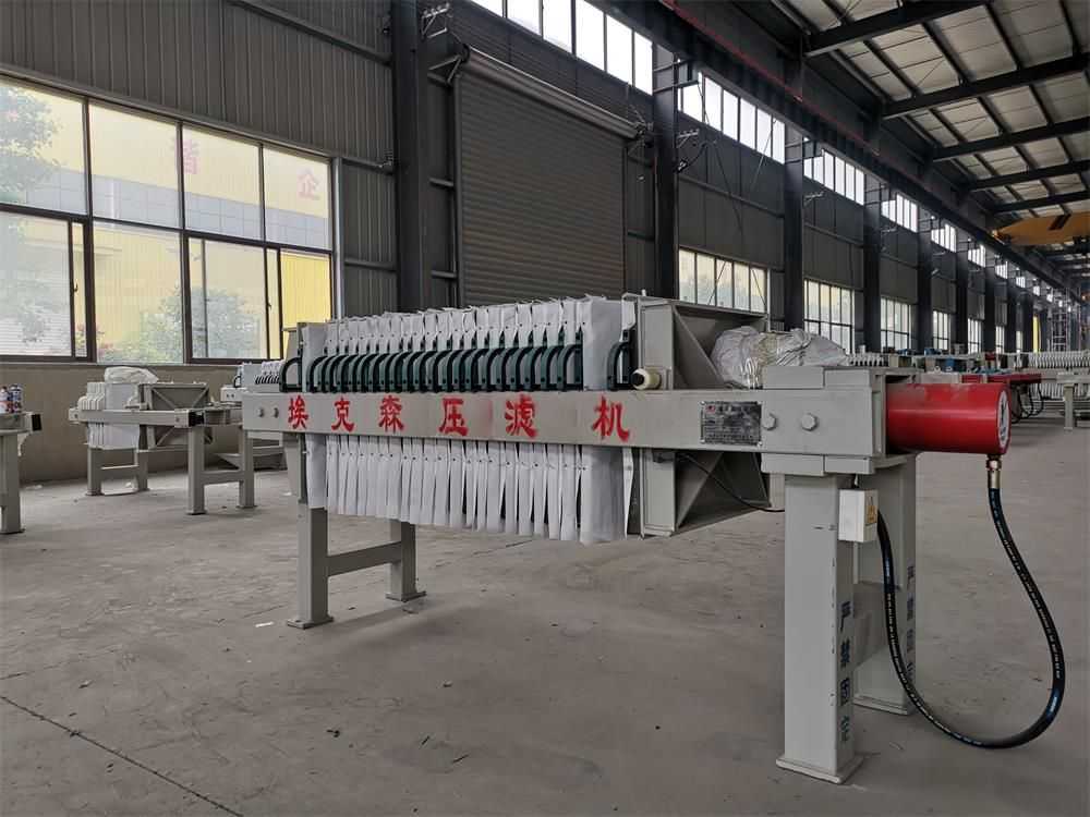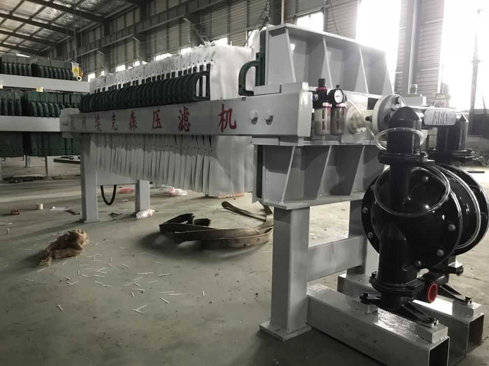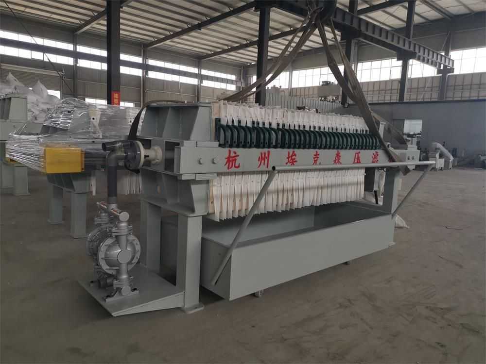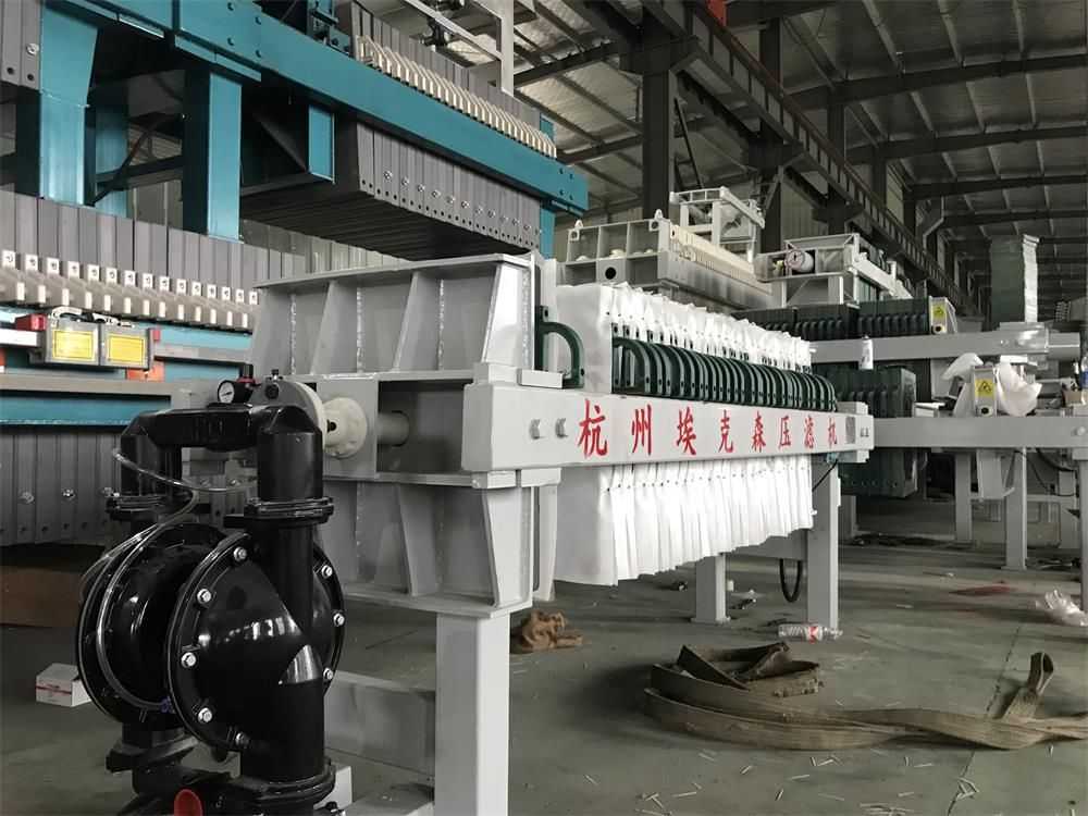 隔膜壓榨壓濾機是由隔膜板和廂式濾板排列組成濾室,在輸料泵的壓力作用下將料漿輸入濾室,通過過濾介質(zhì)(濾布)將料漿中的固體和液體分離,當(dāng)料漿中的固體形成餅后,再向隔膜通入空氣,對濾室內(nèi)的固體充分壓榨。