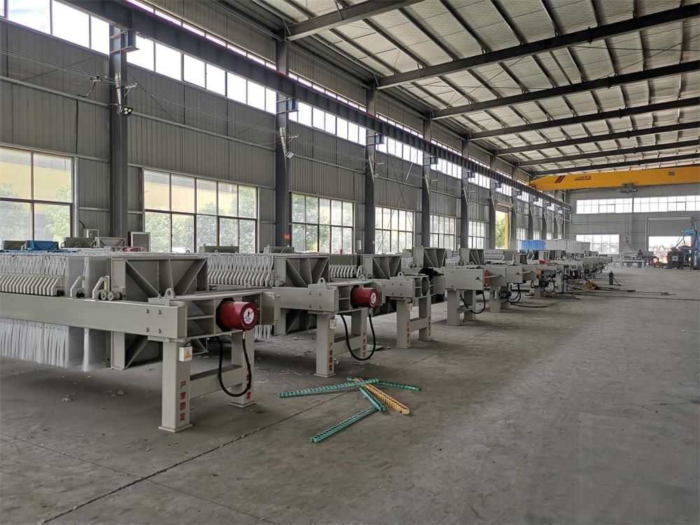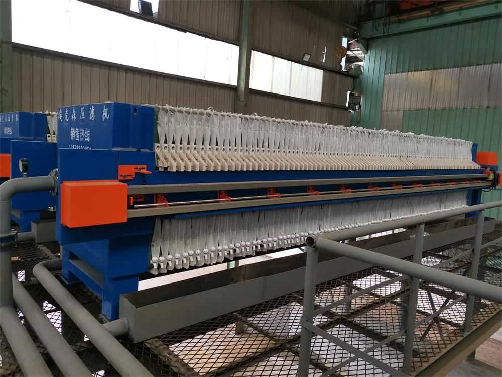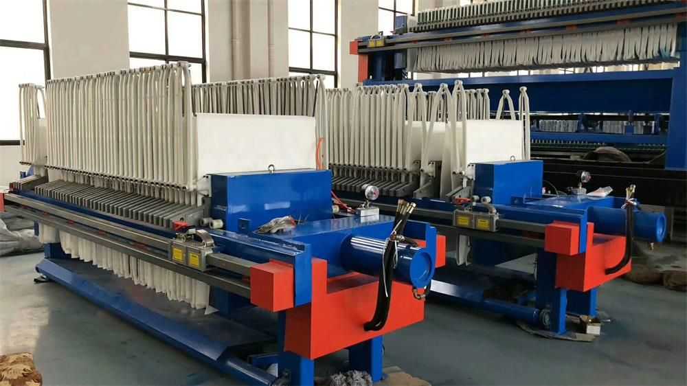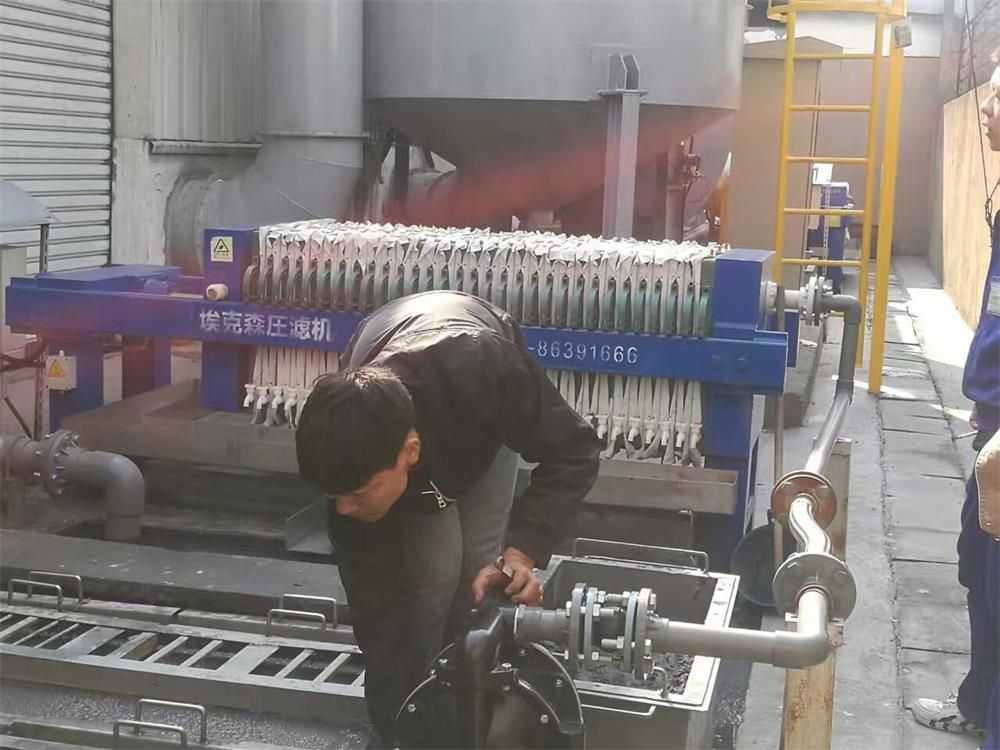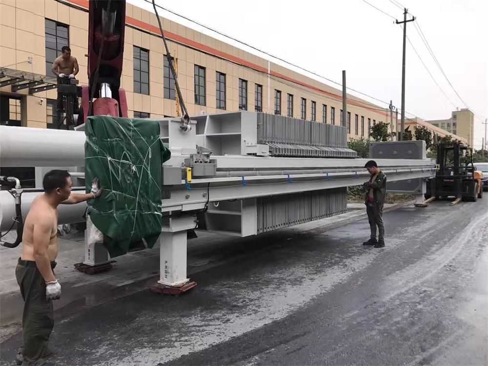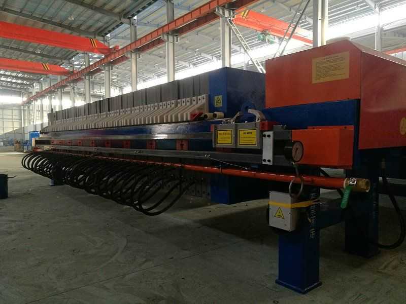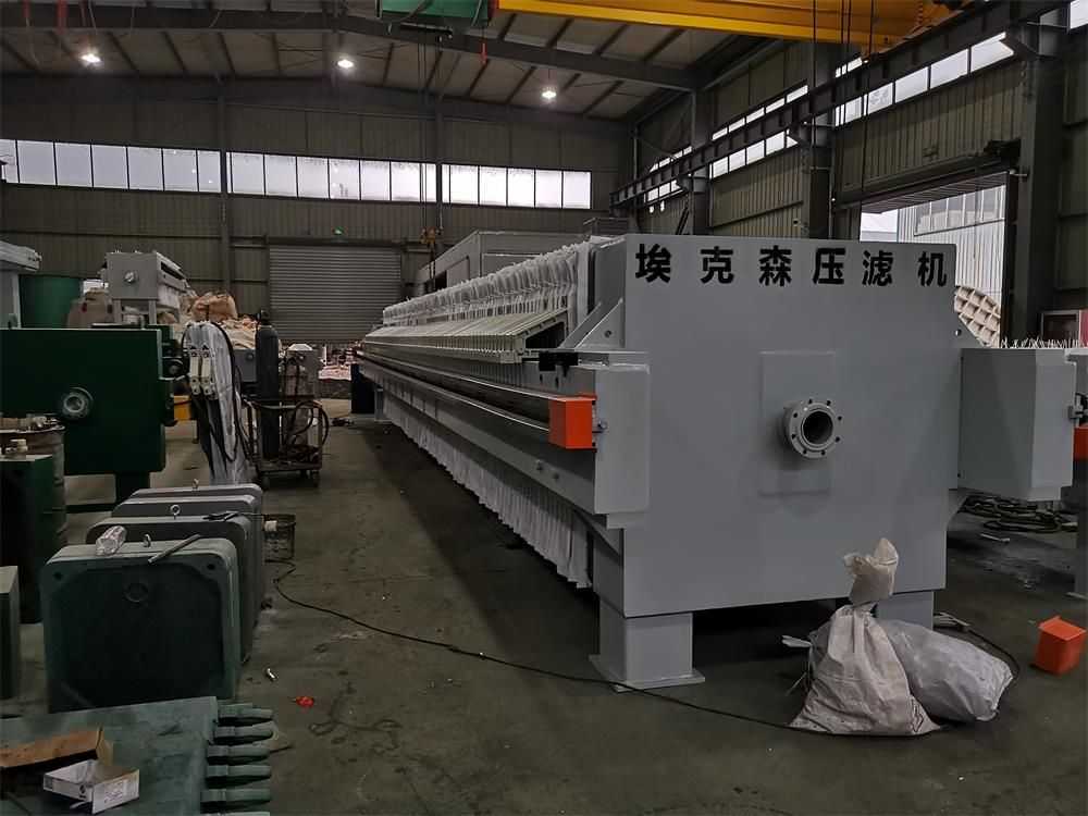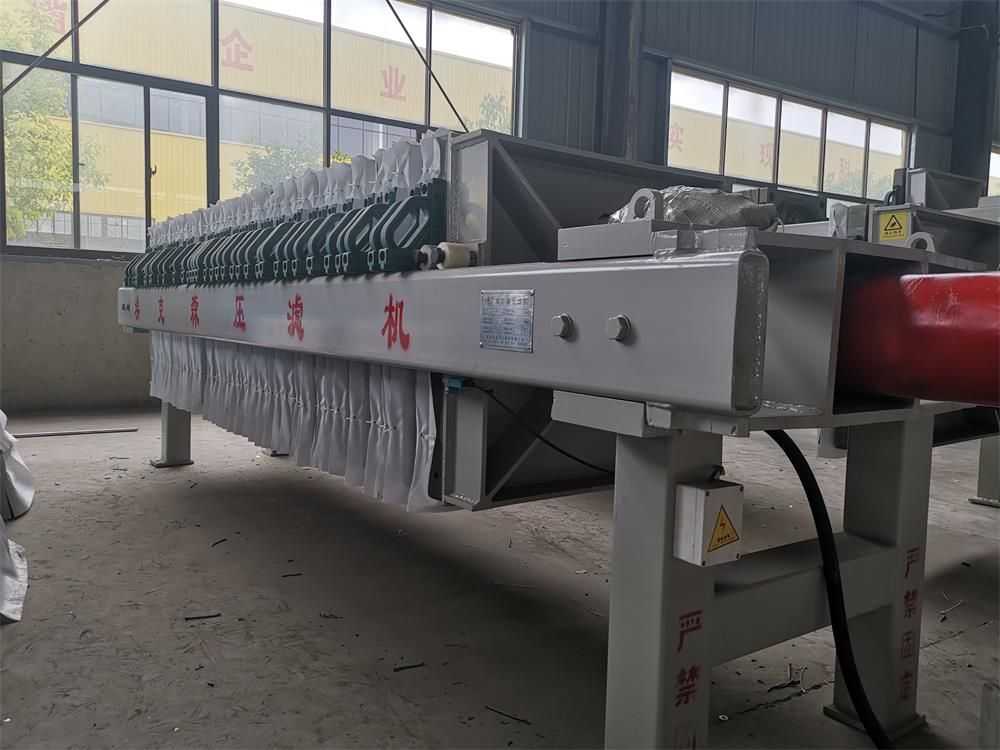 隔膜壓榨壓濾機是由隔膜板和廂式濾板排列組成濾室,在輸料泵的壓力作用下將料漿輸入濾室,通過過濾介質(zhì)(濾布)將料漿中的固體和液體分離,當(dāng)料漿中的固體形成餅后,再向隔膜通入空氣,對濾室內(nèi)的固體充分壓榨。