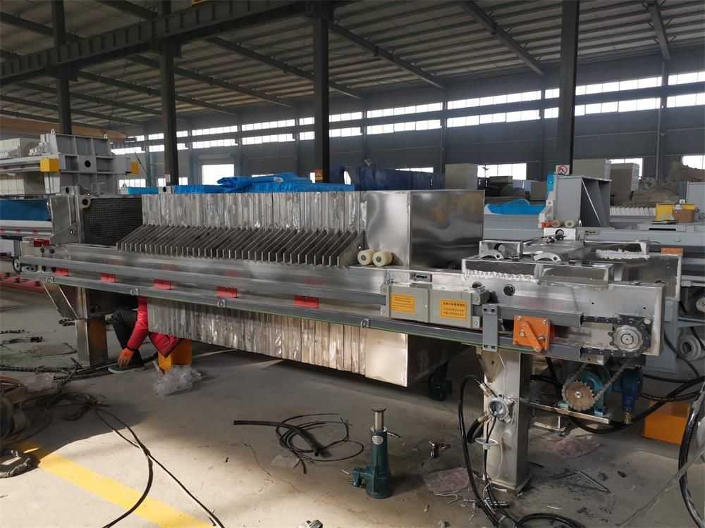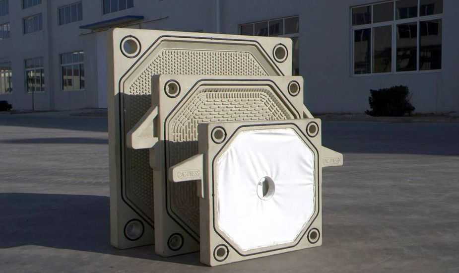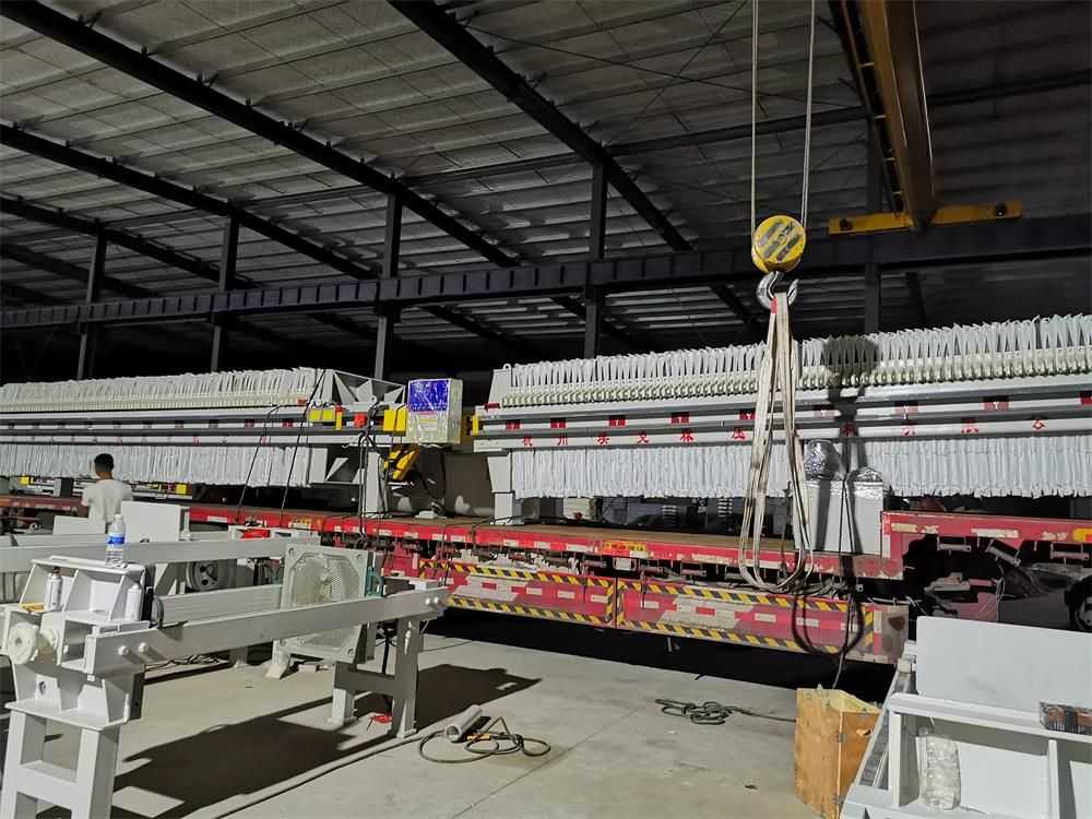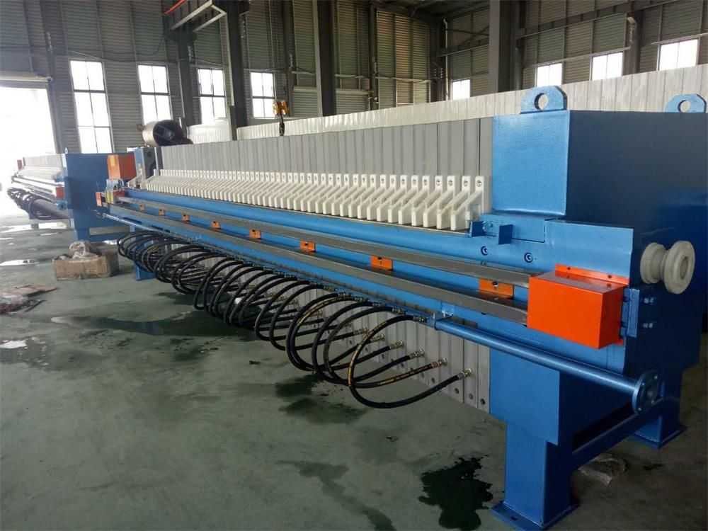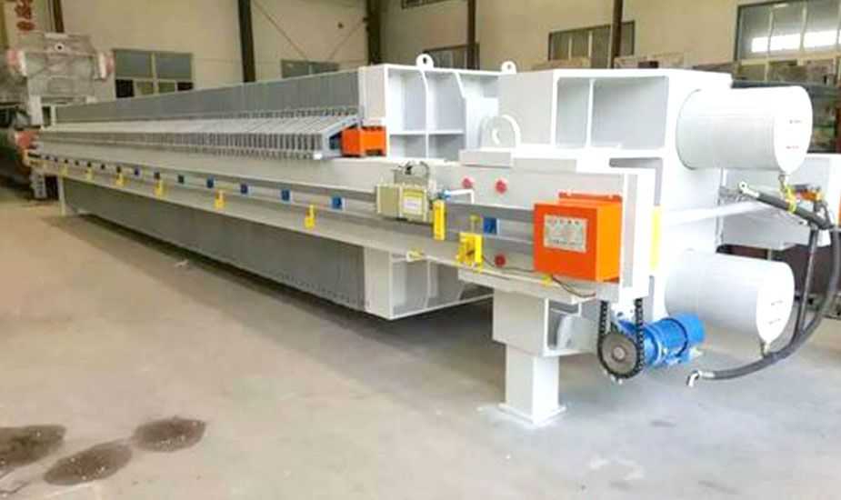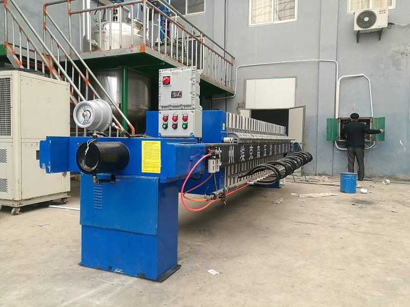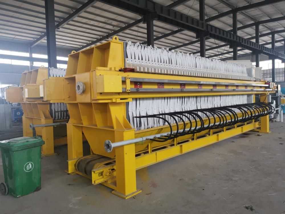 隔膜壓榨壓濾機是由隔膜板和廂式濾板排列組成濾室,在輸料泵的壓力作用下將料漿輸入濾室,通過過濾介質(zhì)(濾布)將料漿中的固體和液體分離,當(dāng)料漿中的固體形成餅后,再向隔膜通入空氣,對濾室內(nèi)的固體充分壓榨。